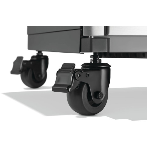 Stabilita na každém povrchu: Výškově nastavitelná kolečka umožňují gril vyrovnat i na nerovné dlažbě či terase.