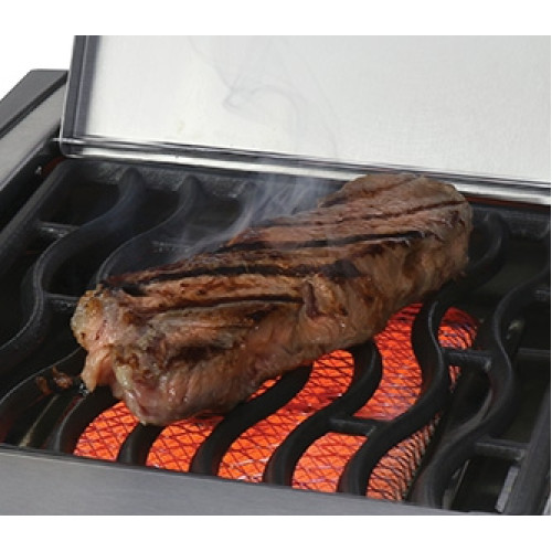 Infračervená SIZZLE ZONE™: Výkonný keramický boční hořák, který dosahuje teploty až 800 °C. Umožňuje bleskové zatažení masa, čímž vytvoří dokonalou krustu a uzamkne veškerou šťávu uvnitř steaků.