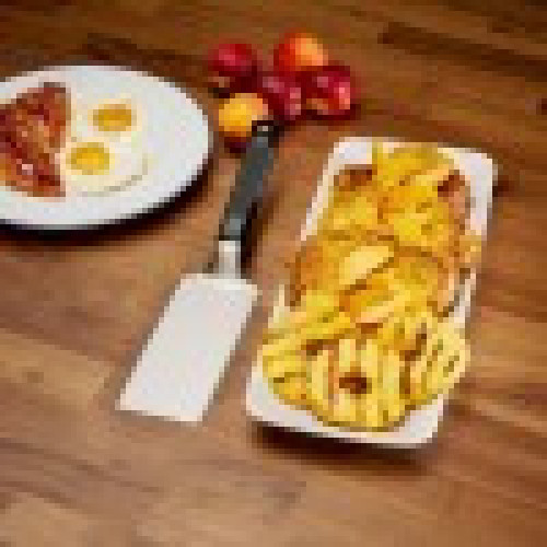 Tato špachtle na grilovací tál nebo planchu je navržena pro výkon, přesnost a všestrannost. Díky třístrannému zkosenému ostří z nerezové oceli se bez námahy klouže pod jídlo, obrací, zvedá a servíruje z jakéhokoli úhlu. Ideální pro rozmačkané burgery, smažená jídla nebo křehké pokrmy. Odolná, žáruvzdorná rukojeť je navržena s ergonomickým, protiskluzovým úchopem, který poskytuje pohodlí a ovladatelnost i při grilování za vysokých teplot. Praktické poutko na zavěšení udržuje špachtli snadno po ruce a úhledně uloženou, když se nepoužívá. Tato špachtle je vyrobena z vysoce kvalitní nerezové oceli a je navržena tak, aby odolala nárokům častého grilování a zároveň poskytovala dlouhotrvající výkon. Nepostradatelný nástroj pro ty, kteří milují grilování na grilovací plotýnce a vyžadují spolehlivost a přesnost u každého pokrmu.